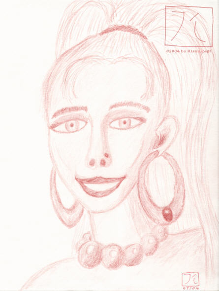Ihre Augen sind graublau und die langen und ungewöhnlicherweise dunkelblonden Haare sind meist zu einem steilen Pferdeschwanz zusammengebunden. Einen Blickfang bildet die Kette aus Silberkugeln um ihren Hals, einen weiteren die 3 Silberarmreife an beiden Handgelenken und die verschiedenen Ohrgehänge aus Silber, sowie der kleine Saphir im linken Nasenflügel. Auffällig sind auch die tiefblau lackierten Fingernägel.