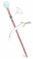| Zauberstab | Aischa's Zauberstab ist ca. 1,60 m hoch, aus einem dunklen Mohagoniholz geschnitzt und mit einer blauen Kristallkugel am oberen Ende verziert. |