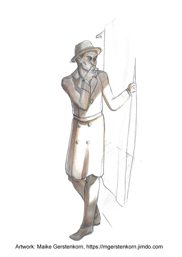 He usually wears a crinkled black or grey suit and never leaves the house without hat and trenchcoat, which is also crinkled. Most of the time heβs chewing on a cold cigarette.