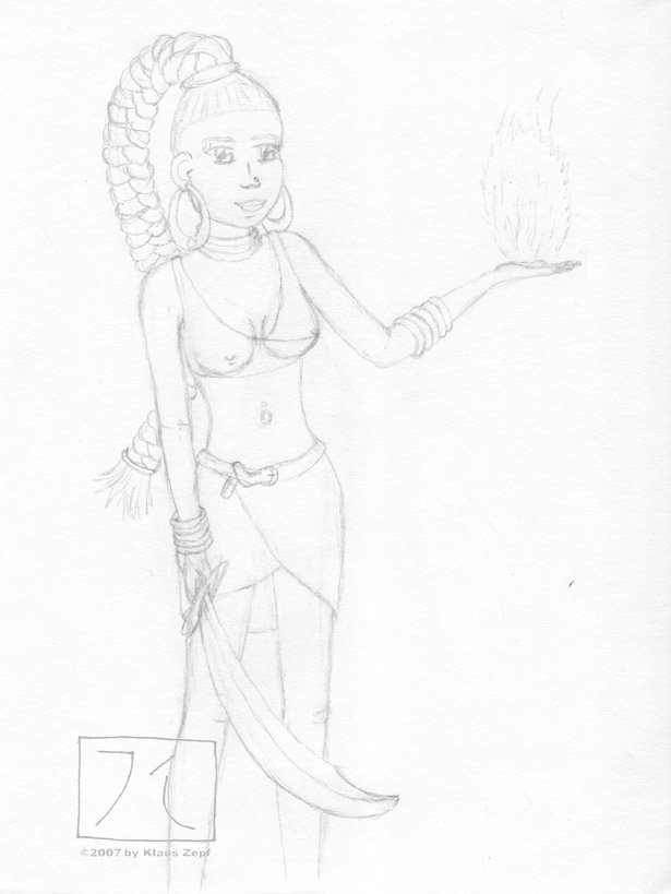 Shayleen’s travel garb consists of little more than a wrap skirt and a wrap top – both in white color which makes for maximum contrast to her ebony skin, and adorned with embroidery. She usually wears sandals instead of closed shoes. Another contrast is her snow white hair which she usually ties up in a pony tail or a single thick braid. Large silver hoops sparkle in her ears and small ring or stud in her left nostril. She wears 4-5 thin bangles on each wrist and a small silver ring in her belly button. Her belt not only holds several leather pouches, but also a curved saber and a curved dagger. A sturdy white hooded cloak, a leather backback and a shoulder bag complete her gear.