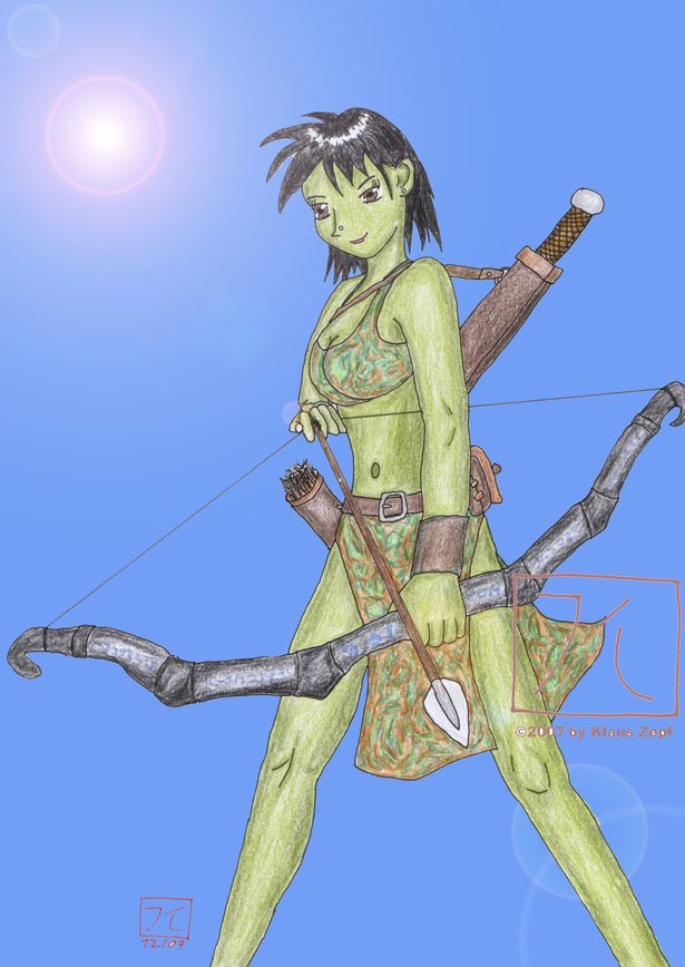 Vara Pak-Ti is a human archer and scout. Her physical appearance is a bit different from the human populace in Barsaive due to her olive skin, which is typical for the human tribe of the Kathan from deep within the Servos jungle. Most Kathans paint or even tattoo white patterns on their skin to create a “natural” camouflage which helps enormously for the continued survival in their natural jungle environment. The exact circumstances which led to Vara’s cammou-tattoos having completely gone without a trace are kept confidential by the archer.