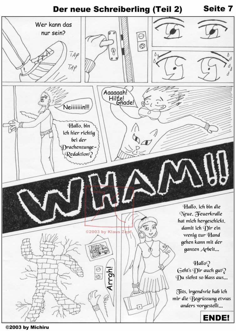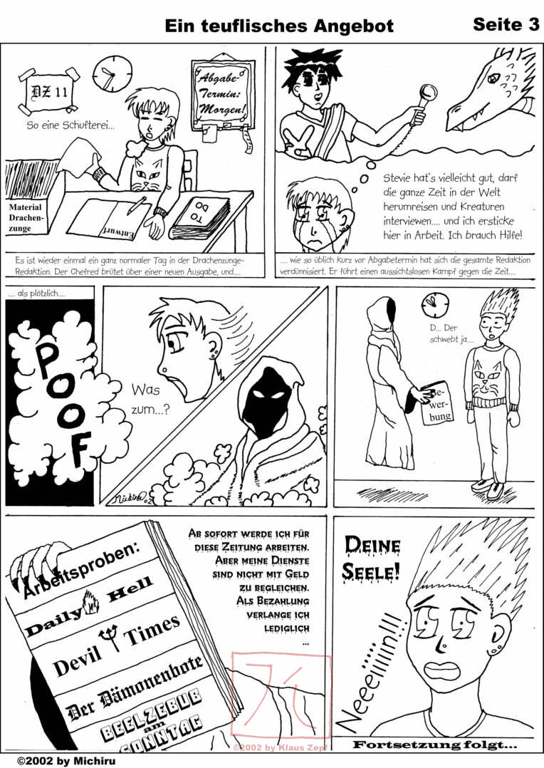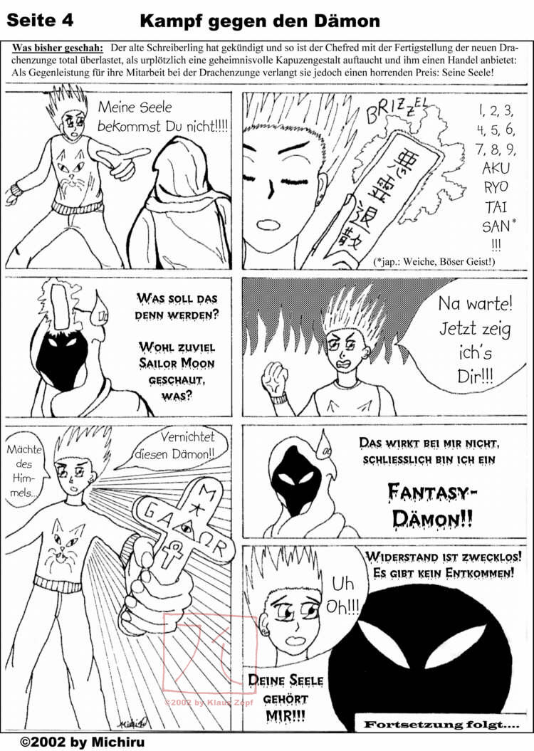 I nevertheless wanted the comic to be continued, so I had to draw it myself from here on. This chapter was first published in issue #10 which also featured a color-poster of a dragon, drawn by my back-then girlfriend Carina.