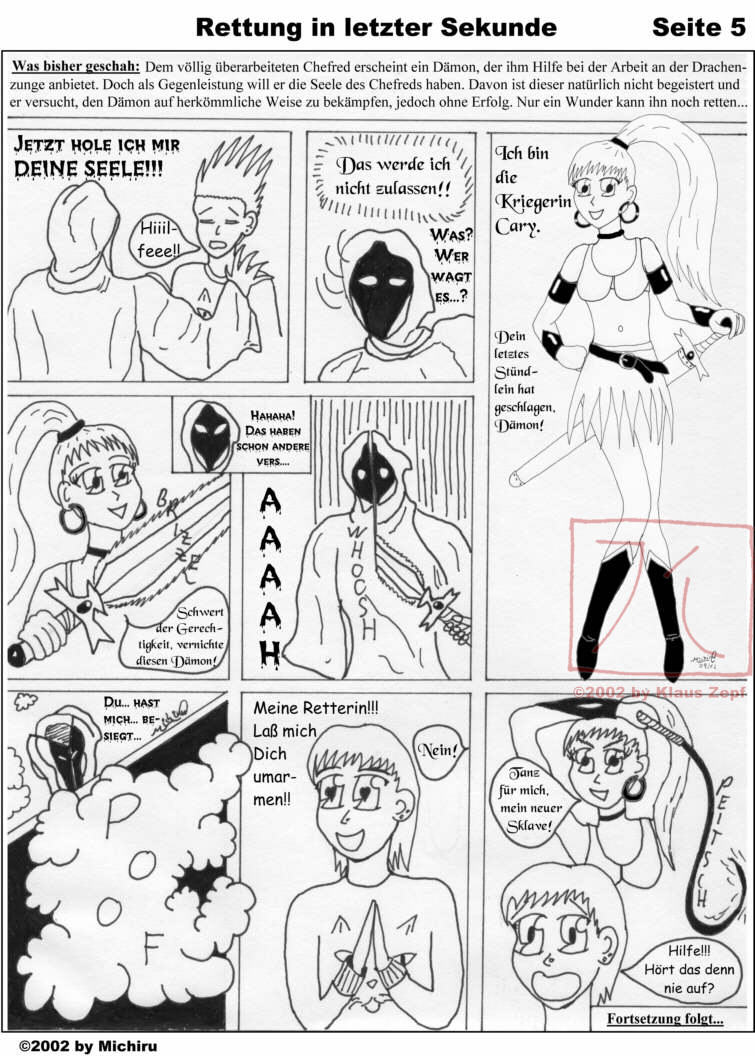 Finally the editor is saved by a warrioress with a magic sword who vanquishes the evil demon. But is he really safe? First published in issue #13, which was also the final issue of our club-magazine. Nobody really cared about the magazine anymore or even threw it away without reading it, so we were pissed off and let it be. |