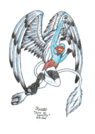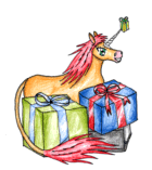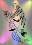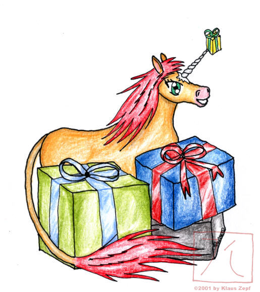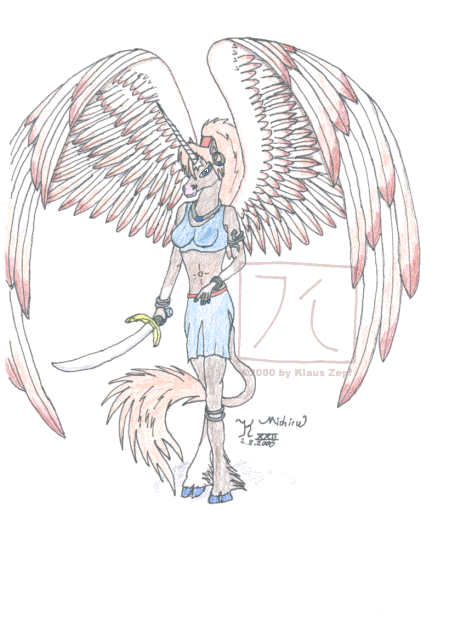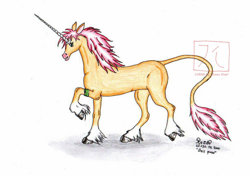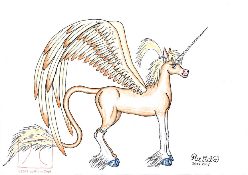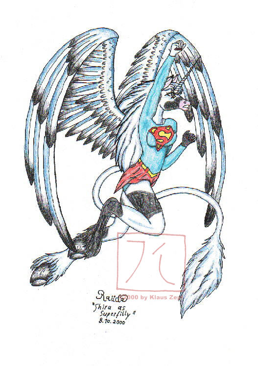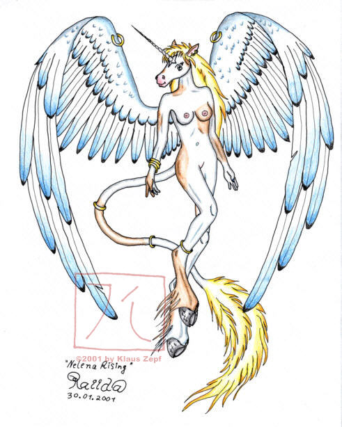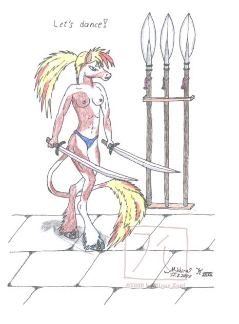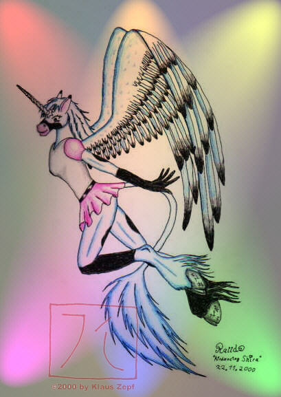 In this gallery there are anthropomorphic characters with equine shapes, be that horses, unicorns, pegasi or alicorns. I owe the ability to draw these characters mainly to Martin and Daniela Reichelt, aka. Shira and Nelena. In 2000 and 2001 they taught me how to draw equine furry art and so it is no wonder, that many pictures from that time show their furry characters.