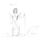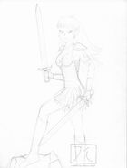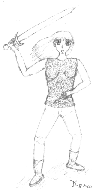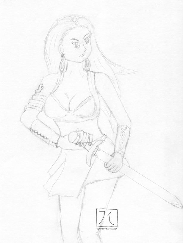 This is another RPG-character of mine from DSA: Her name is Caya Berlind and she's a young warrior who seems to have come into trouble as she's wielding her huge bastard-sword, ready for the enemy to attack... I drew this during an adventure at a RPG-con in southern Germany on the last weekend of February 2000. |
