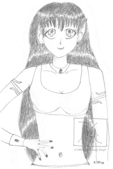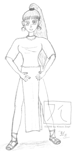 This is Teleria of K'than, my dearest Earthdawn-character. She's an elven swordmaster and horror-stalker and has made it through many dangerous adventures. Don't let her appearance fool you: she's almost 50 years old and has a cute little son named Fellin. This picture is from 1998 and it's the first manga-style pic I've ever drawn of one of my RPG-characters. In December 99 I dug it out again and gave it a major overhaul (especially the hair and some other stuff). |