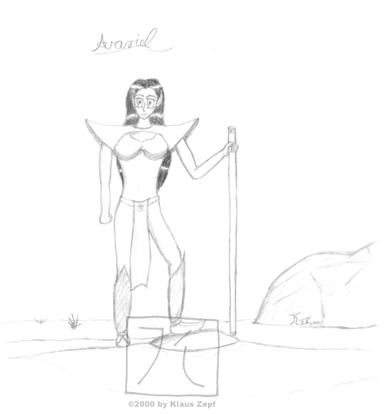 made this picture for a friend of mine who plays this character in an RPG that he developed himself. Avariel is an elven battle mage that can cast powerful fire-spells and also fight very well with her staff. I drew this when I was a guest-player taking over this character for one session. The GM wasn't very enthusiastic about it, though: 3 out of 5 players were mostly drawing their current characters instead of roleplaying... |
