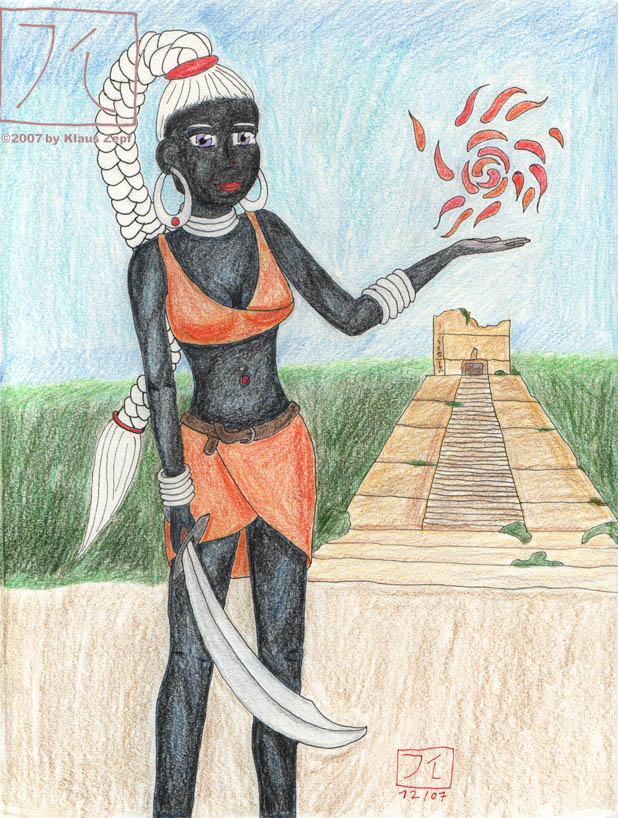 One of my first short stories (see the Library-part of the Realm as soon as it's online) featured this heroine called Dhana. In a medieval/fantasy setting she is a warrioress who fights against evil and who is prophesied a great destiny...