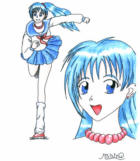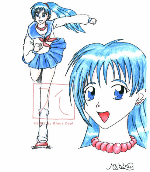 I started the sketch for this picture in fall 2001, but left it unfinished until about May 2002. It was the running-pose I saw in a "How to draw Manga"-book that inspired me for this picture, and I felt that Michiru should look a bit happier, so that's it. The face of the left figure I messed up a bit, but I love the expression on the big face on the right. Colored with Polychromos. |