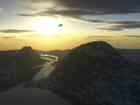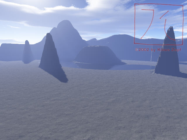 This was also made with Terragen, but the terrain was created using the random-terrain feature of Terragen and slightly modified afterwards. This landscape seemed so barren that I decided to put in the shape of a small drake. |