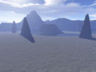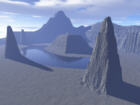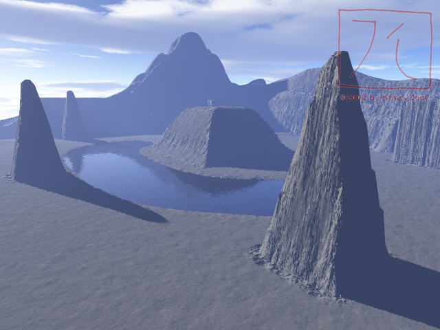 Some kind of pyramid surrounded by a lake and some rocky spires. This picture was made using the Terragen 3D-terrain-creator program. It was my first try with a self-made map from which the program made this 3D landscape. |