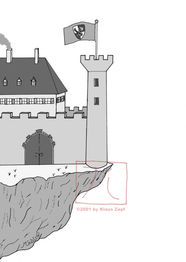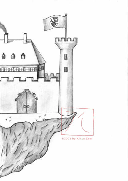 The first version of the castle-picture. After scanning the inked original I wandted to experiment a bit and see if I could shade it with the computer as well. And I like the result, even though it looks a bit more "artificial" this way. |