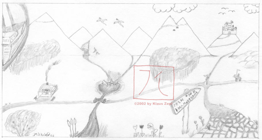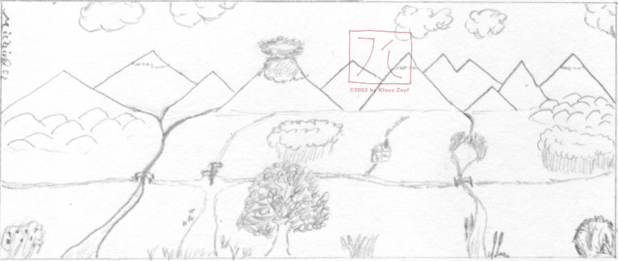 Another attempt, this time I drew a landscape full of beasts and plants and other stuff, so it would look a bit more alive. The road-sign reads "Land of Adventures" in rune letters. I've tried to make the road look kinda "inviting" for any adventure-seekers almost as if they could jump right into the picture. |