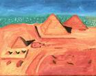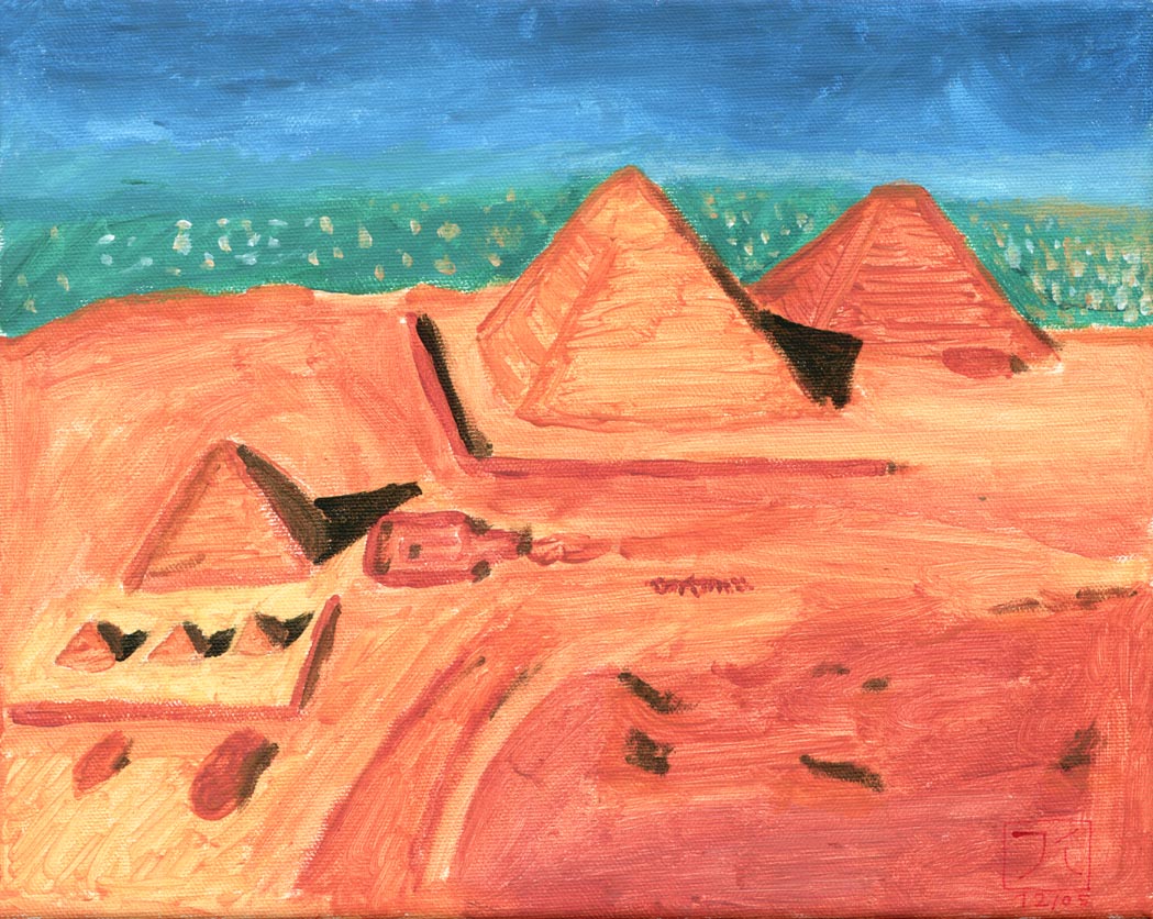 This was my first attempt at painting with acrylic paint on canvas. It shows one of my favorite sightseeing places in the world: the Giza-Plateau in Egypt with the three Great Pyramids.