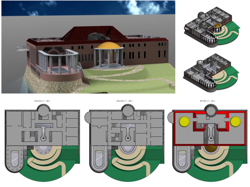 Image/Floorplan | 01/2018 | A 3d-view including the floorplans of Titon Mansion on planet Rathalay which originally belonged to Mia’s foster father, and later was taken over by the very pirates that had been responsible for his death. Mia’s player has created this 3d-model from my hand-drawn and scanned floorplans and elaborated on them. There is also a basement which is not depicted here. The round hardpoints on the roof feature air defense cannons and there’s also a shield generator, all of which is powered by a large generator in the basement. And there’s also the secret underwater chamber. |