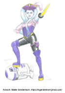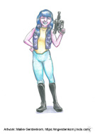 My very first Star Wars character, handed to me by my GM at the time to get me hooked for the system. Her background was derived from Anakin Skywalker in Episode 1: Gina grew up as a slave on Tatooine where she worked in a speeder-shop and repaired stuff. She was bought out by a nice spacer when he collected a debt from the shop owner, and left Tatooine in his spaceship. Since then she's a vagrant between the stars, trying to scrape enough money to buy out her older sister whom she had to leave behind as a slave. |
