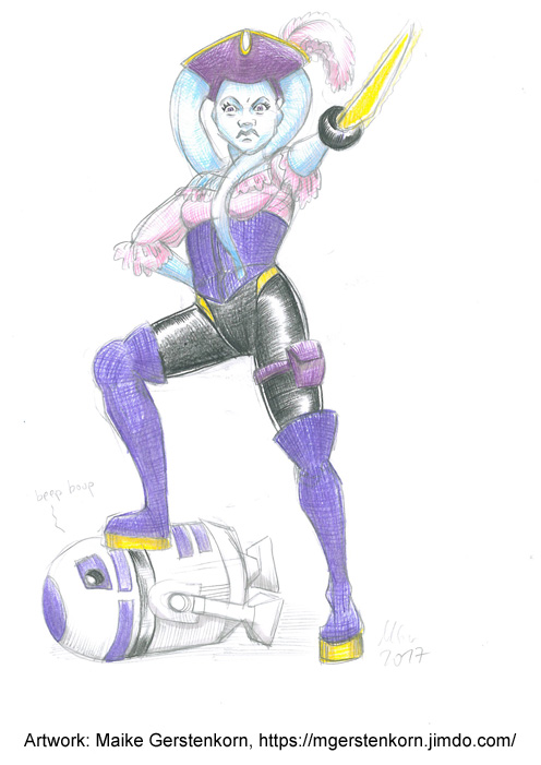 Everyone, except for Tiria. She was already dressed up for her role, but as a diva she let everyone wait while she was still in her trailer, when all hell broke loose. Through some beneficial circumstance her trailer was not hit during the initial blast, but instead got pushed to the side and sheltered by some sturdy structure which prevented it from being destroyed. When Tiria woke up with merely a concussion and a small laceration she found that all around her an apocalyptic rain of destruction had gone down, which had destroyed everyone and everything. For hours she stumbled through craters and blasted ruins, saw twisted metal and torn bodies, and at some point her mind decided to do the only thing it could to cope with all this horror: It snapped and Tiria became the character she used to portray. Charyp’soma the Buccaneer Queen, whose crew and ship had been destroyed by the evil Star Dominion in retaliation for her past raids, swore an oath over her fallen comrades to find a new ship and crew and take revenge on the Star Dominion for this.