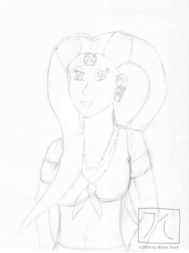 She usually dresses in typical pirate attire like striped pants, black boots, knotted shirt with wide sleeves and an ornate twi’lek headdress featuring a medal with skull and crossbones attached to it. She also wears lots of bangles, bracelets, rings and necklaces and a broad sash as a belt where she’s tucked away her heavy blaster pistol and the decorative scabbard of her saber.