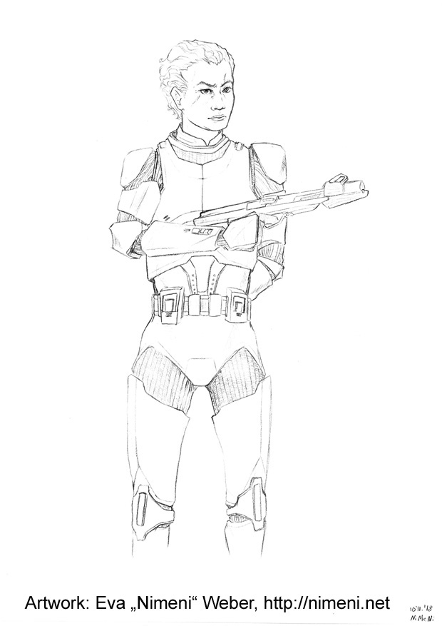 Among the surviving subjects, however, was one where the mutation had caused a chromosome shift: it was female. Physically almost identical to her male counterparts the female clone underwent numerous tests and examinations as the Kaminoans were highly interested in its capabilities. When the tests didn’t yield a satisfying result they instead put clone unit Ja-Y.D-19-11.25#5, as her full designation would be, into the combat conditioning program to evaluate her performance against the male counterparts.