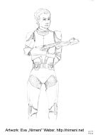 Jayd is fairly tall and has a muscular build. Her skin is tanned and her curly black hair is cut in a short, military fashion. Her facial features are as sharp as those of her genetic donator Jango Fett and only on second glance do they reveal some hints of femininity.