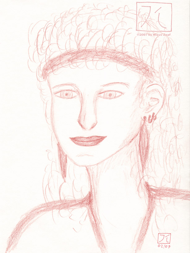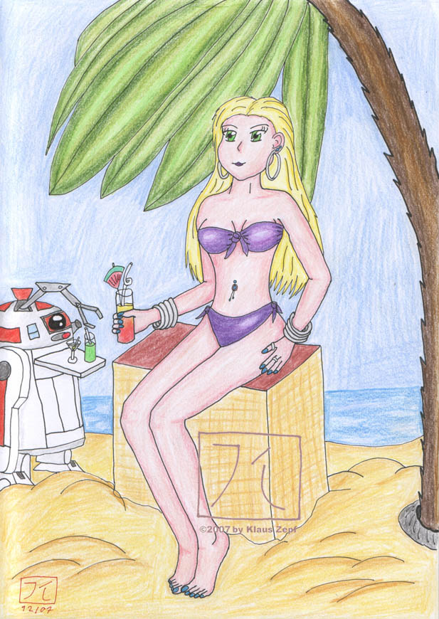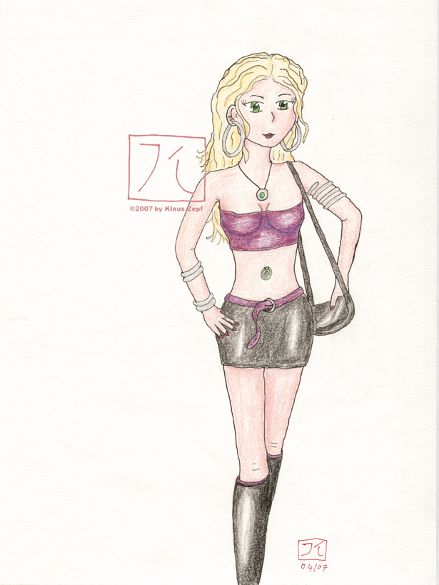 Mel – aka. Trance – stands 1,76 meters tall with a slender build, except for her slightly above average bust size. After her body had been modified for an undercover mission as a pleasure slave, a large tattoo of a blue-scaled dragonserpent curled several times around her entire body from her left ankle all the way to her right shoulder. Only later she found out that it was permanent, contrary to what had been promised. Most of the other modifications have gone in the meantime, so that her hair has grown out the blue part and is now blonde again, and her facial tattoos have faded so they are almost unnoticeable now. During the time her body was suspended her earlobes which had been stretched to 4 cm size have retired to almost an inch. Mel usually wears a pair of metallic-blue triskelion-plugs, but she can also be seen wearing simple silver flesh tunnels or other pieces of jewelry in her earlobes. She also continues to wear a belly-button piercing with a blue gem, as well as her nipple rings. Rarely she sticks out her tongue to show her tongue-piercing. When she left her new-found family she also accepted their gift in form of a ring for her stretched septum. Although she had never been happy with a nose ring as it had always been a token of slavery for her and reminded her of her own time as a pleasure slave, but Shanta had correctly argued that it made her look sufficiently different so she could more easily avoid recognition.