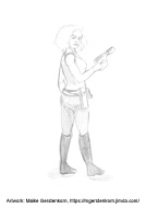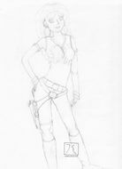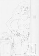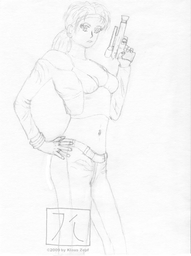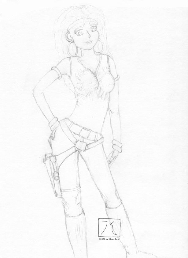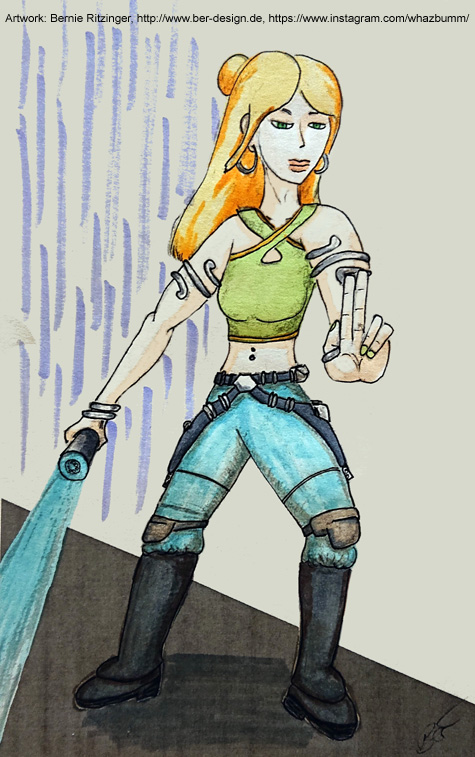 Mel’s everyday clothes have remained largely the same as before, aiming for functionality and movement. Usually she wears tight fitting pants in dark blue color and polished black leather boots. Quickdraw-holsters for her blaster pistols are strapped to her thighs and her belt contains a smart clip-reload-system for the power packs. In another pouch on her belt she carries her lightsaber. Her top varies depending on mood and weather, but oftentimes Mel wears a tank top or spaghetti top of varied, but usually darker colors, sometimes short enough to reveal her belly button piercing. For rough weather or colder climate she reverts to long sleeved tops and adds a trendy blue and white leather jacket.