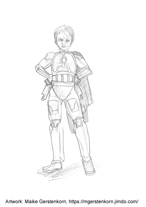 When hunting criminals or generally “on duty” Rayn always wears her black and red body armor and her helmet, both of which show signs of intense use. Under her armor she wears a robust black body glove. Black military pants cover her legs, while her boots are armored on the front up to her knees as well. Her helmet has a fixed, reflective visor with a flash-filter that protects her from the effects of flashbang grenades and the like, but does not have a breathing filter or oxygen supply. Her main armament are a pair of heavy blaster pistols which she carries in quickdraw-holsters on her thighs. A vibro-knife is hidden behind the armor of her right boot and some stun-grenades are tied to her belt. She also acquired a telescopic shortstaff that she carries in a belt-pouch.