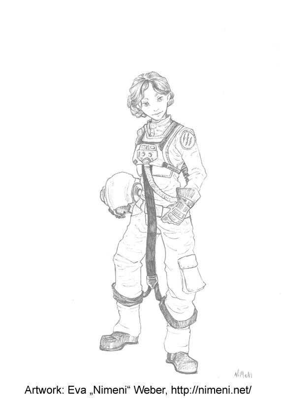 | Reena wearing her flight suit (Artwork by Eva "Nimeni" Weber) |